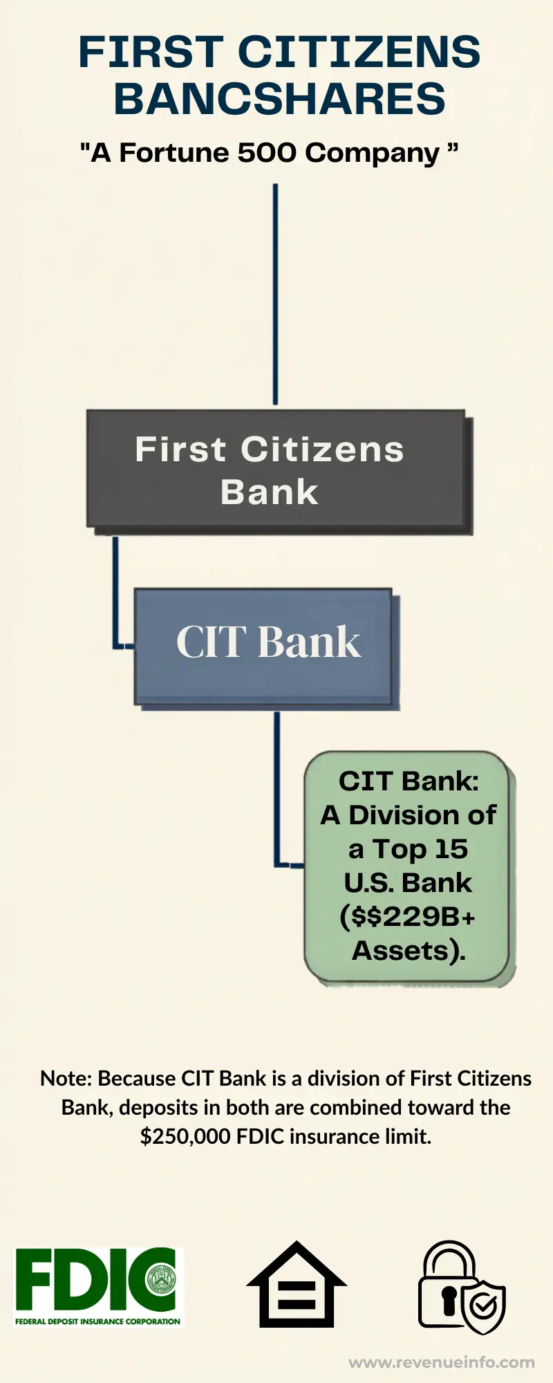 - Because CIT Bank operates as a division of First Citizens Bank, your $250,000 FDIC limit is shared across both institutions.